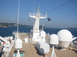 | ベッドは普段より幅が狭いのですが、それよりもズーンと低く響くエンジン音の方がちょっと気になりました。目が覚めると既に明るく、到着予定時刻の1時間位前でしたが鳥羽湾に入っていました。天気は快晴、絶好の伊勢参り日和です。 | ||