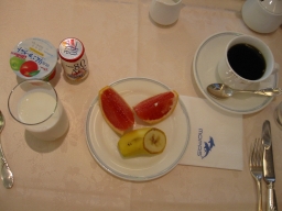![]() | 朝食のためいつもの様に4Fからエレベーターで2Fの「瑞穂」に降りて行きます。相変わらず胃腸がくたびれており、折角のビュッフェもほとんど意味をなさなくなりました。食べられたのはフルーツ、牛乳、ヨーグルト、乳酸飲料と、消化にパワーを要さない流動食系のみでした。 | ![]() |