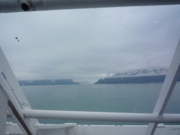 | 12時頃様子を見に13Fサンライズ・デッキに出ると、遠くの方にボヤっと氷河らしきものが見えています。再接近するまでにはここからまだ1時間以上あるでしょうが、オモテ側の見晴らしのいい場所を確保しなくては後悔しそうです。