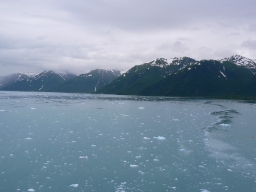 | 寒さは相変わらずですが、着実にフネは氷河に近づいて行っています。今頃夫は何をしているのだろう、ふと気になりました。13時40分頃の氷河の様子ですが、北米大陸最大の幅は6マイル(約9.6km)もあります。高さは90mです。 |  |