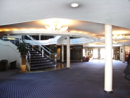 | 桟橋を移動し、船尾側の乗船口から「おれんじ8」に乗り込みました。乗っていきなりエスカレーターがあってビックリでした。エスカレーターを上り切ると3甲板で、受付とレストランがありました。ここから2階分吹き抜けとなった空間に階段があり、広々としていました。 | ![]() | ![]() |