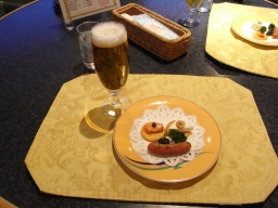 | ディナーは乗船の予約時に、洋食か和食を選択しますが私達は洋食にしました。飲み物はビールかワインかオレンジジュースが1杯付いています。まずはオードブルとコーンポタージュを。お皿がオレンジフェリーのロゴ入りでお洒落です。 | ![]() | ![]() |