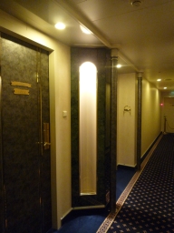 | 食事が終わって一旦部屋に戻る際「新日本海フェリー(ゆうかり)との類似点その@」を発見。この廊下の雰囲気はかなり似ていると思います。 左が本船「ぱしふぃっく びいなす」 右が新日本海フェリー「ゆうかり」 | ![]() | ![]() |