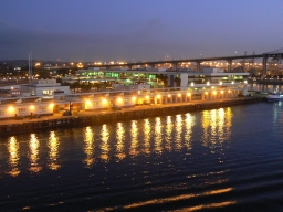 ![]() | 「ノーウェジアン・スター」の岸壁を通り過ぎます。入港がちょうど日の出の時間と重なっているので、段々夜が明けていっていました。 | |