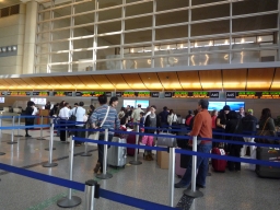 | 同じバスには空港のターミナル1(USエアなど)、2(スターアライアンス等)、3(アラスカ)とインターナショナル・ターミナルに行く乗客が乗っていたのですが、最後のインターナショナルまで残っていたのは私たち二人だけでした。 | ![]() | |