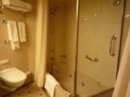 ![]() | ベランダも部屋のスパンが大きい分広さがあります。この上は「リド・デッキ」なので、天井が大きくせり出して上方の視界はあまり良くありません。これは外国船では何度か経験しています。 バスルームは2つのシンクがあり、これはかなり便利です。またジャグージー付きのバスタブの他独立したシャワースペースがあるので、日本式に洗ってから湯船に浸かることが出来るのがポイントです。 | |