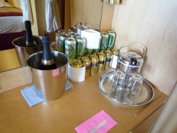 | それから、外国船はアルコールの持ち込みが出来ないので予めオンラインでビールとワインパッケージ(ナビゲーターズ、7本でUSD228.85)を購入してあります。ハイネケン6缶(USD23)、ミラー1ダース(MGD、USD21.85×2)が並べて置いてありました。これは部屋にある冷蔵庫で冷やしておくことにします。ウエルカムシャンパンは旅行会社のサービスみたいでした。 | ![]() | |