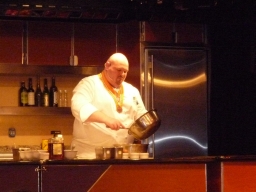 | そうしているうちに11時半からの本船のエグゼクティブ・シェフ、アンドレアスによる「アップル・シュトゥルーデル(Apfelstrudel)」の作り方教室があったので夫に付き合ってもらい見に行くことにしました。本船にはそれ専用の立派な施設2F「カリナリー・アーツ・センター」があり、身近でシェフのショーを見ることが出来るのです。 | ![]() | ||