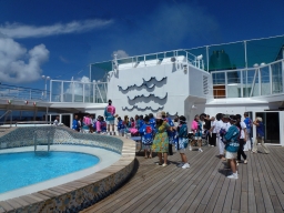 | そのまま居残り練に突入し、そろそろお昼にと思っているとちょうど入れ替わりにオフィサー達が入って来ました。クルーショーの練習のようです。日本船のオフィサーはすることが多くて大変そうです。 |  |