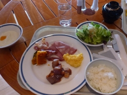 | (時計回りに)ビネグレットドレッシングのサラダ、ハムステーキ、かぼちゃ、ナスミートと好物のオンパレードで完璧でした。 【画像はクリックで拡大】 | ![]() | ![]() | |||||||||||||||||||||||||