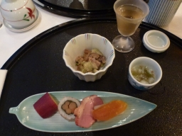 ![]() | 食前酒 梅酒 先附 大徳寺麩胡麻和え 前菜物 新香寿司 九十梔子煮 唐墨大根 鴨粒胡椒 小蓋物 蛸わさび | ||||||||||||||||||||||||||