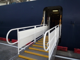 ![]() | 岸壁に向かってまっすぐ進入した後、タグに押されて右回頭し定刻より少し早い7時45分に左舷着岸しました。無線受信機のおかげで、目論みどおりこの着岸プロセスはますます楽しいイベントになりました。 そろそろ朝食かと思ったところ、双眼鏡を覗いている夫が「大きなフネが入港してくる」と言うのでもうしばらくスタンバイしていることにしました。 | |