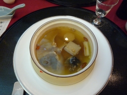 | (強肴)七宝蒸し フカヒレ すっぽん 干し貝柱 聖護院蕪 クコの実 松の実 焼白葱 生姜 だいだい | ||