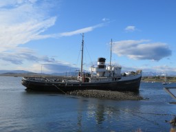 | 朝にみかけたタグボート「ST CHRITOPHER」に関する説明もありました。1930年にビーグル水道で、暗礁に乗り上げて沈没した客船「モンテ・セルバンテス(MV Monte Cervantes)」を、20年後にスクラップ目的で引き揚げようとして、失敗したそうです。 |  |