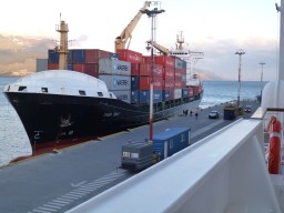 | ところが、右舷反対サイドの小さいコンテナ船が舫を解いて、まさに今出て行こうとしています。キャプテンによれば、ウシュアイアはタグボートがいないため本船は出ていけないそうですが...。 |  |