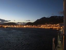 | 23時頃、バルコニーから夜の帳がおりるウシュアイアを見ましたが、まだ出る気配はありません。風が弱まらないから仕方ないのですが、桟橋の反対側だったら出られたであろうにと思います。慎重なキャプテン以下オフィサー達は今日の仕事が終了せず大変です。 |  |