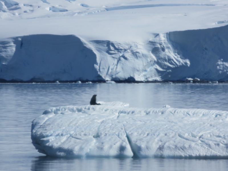 | このゴハン中、ブリッジからの案内通りアザラシ(系)が氷山に乗っかって右舷に流れて来ました。休憩しているのか、単騎なのが面白いです。 |