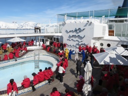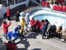 | アザラシ達がゆっくり遠ざかるのを眺め、11Fに行く準備をします。14時から「赤いパルカでプールサイドに集合!!」という南極の海風と氷を体感しようという催しがあるので出かけました。 |