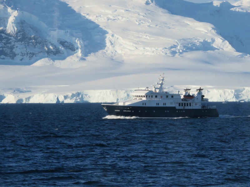 | 慌てて7Fに駆け下りると、既に遠ざかりフェーズに入っていました。でもとてもキレイです。南極を航行する探検船はすべてアイスクラス(耐氷能力)を備えていて、シルバー・エクスプローラーは1A(夏秋の多年氷が一部混在する薄い一年氷(1mぐらい)がある海域に対応)、シー・エクスプローラーは1C(50cmぐらいの氷)だそうです。 |