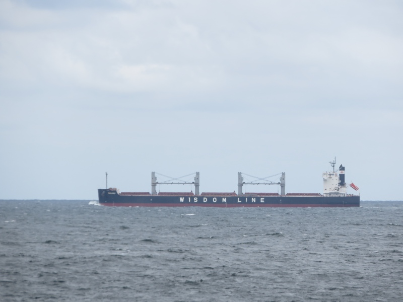 | ダンス中でも、遠くにフネが見えるとつい外に出て見てみたくなります。望遠で撮影すると「WISDOM NALUHU」というハンディマックスで、ウイズダムは台湾のオペレーターです。この船は常石造船の2010年出来でした。 【画像はクリックでズーム】 | ![]() | ||||||||||||||||||||||||