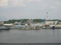 | 横須賀駅に着くとほとんどの見学者は到着していました。そこから歩いて5分位の所に海上自衛隊の横須賀地方総監部がありました。自衛隊の基地に入るのは初めてだったのでちょっと緊張しました。また写真をどの程度撮っていいのかわからなかったので、とりあえず自粛していました。門の所で広報の方が横須賀地方隊のパンフレットをくれ、中に案内してくれました。写真撮影は全然構わないそうなので、持っていったデジカメをスタンバイ。そして吉倉桟橋の方に歩いて行くとまずは訓練から戻ったとおぼしき潜水艦(艦名確認出来ず)が歓迎するかの様に入港してきました。 |  |