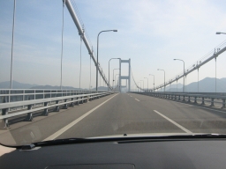 | ホテルでゆっくり朝食を食べた後、私がハンドルを握ってしまなみ海道を尾道まで戻りました。本来はこのルートが一般的なのですが、昨日は広島空港から東に尾道までと尾道から向島、因島、生口島までのルートをショートカットして、広島空港から南下してフェリーに乗って大三島から海道に乗ったのでした。しまなみ海道と言っても一部は建設中であるため、島に入った途端一般道に降ろされたりして料金支払いがかなり面倒でしたがそれはそれ、風光明媚な瀬戸内を堪能することが出来ました。ちなみに今治北から尾道までの約55kmが今治北〜大島南間1,700円、大島北〜生口島南間1,550円、生口島北〜西瀬戸尾道間1,300円の3区間に分かれています。結構高いです。 | ![]() | |