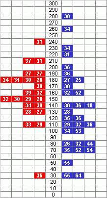 下のグラフはかつての職場で2001年春頃社長が面白がって社員の分布図を集めたものです。左側が女性、右側が男性の分布で1マスが1名を表しています。白抜きの数字は当時の年齢です。女性の方は比較的わかり易い分布となっていますが、男性の幅が広いのが特徴です。また50代以上の男性はほぼ100点未満に分布しています。50代の女性のサンプルがなかったのですが、200点以上に分布する可能性がありそうな気がします。